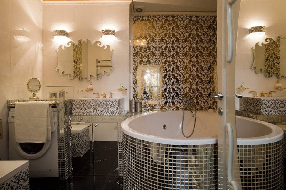 Очень красиво в помещении любого размера смотрится мозаика. Да, работа кропотливая, но оно того стоит. Отличная идея – если с цветной мозаикой смешать металлизированные фрагменты. Смотрится очень стильно и дерзко. К тому же такое решение отлично вписывается в классический интерьер и дизайны модерн, хай-тек.