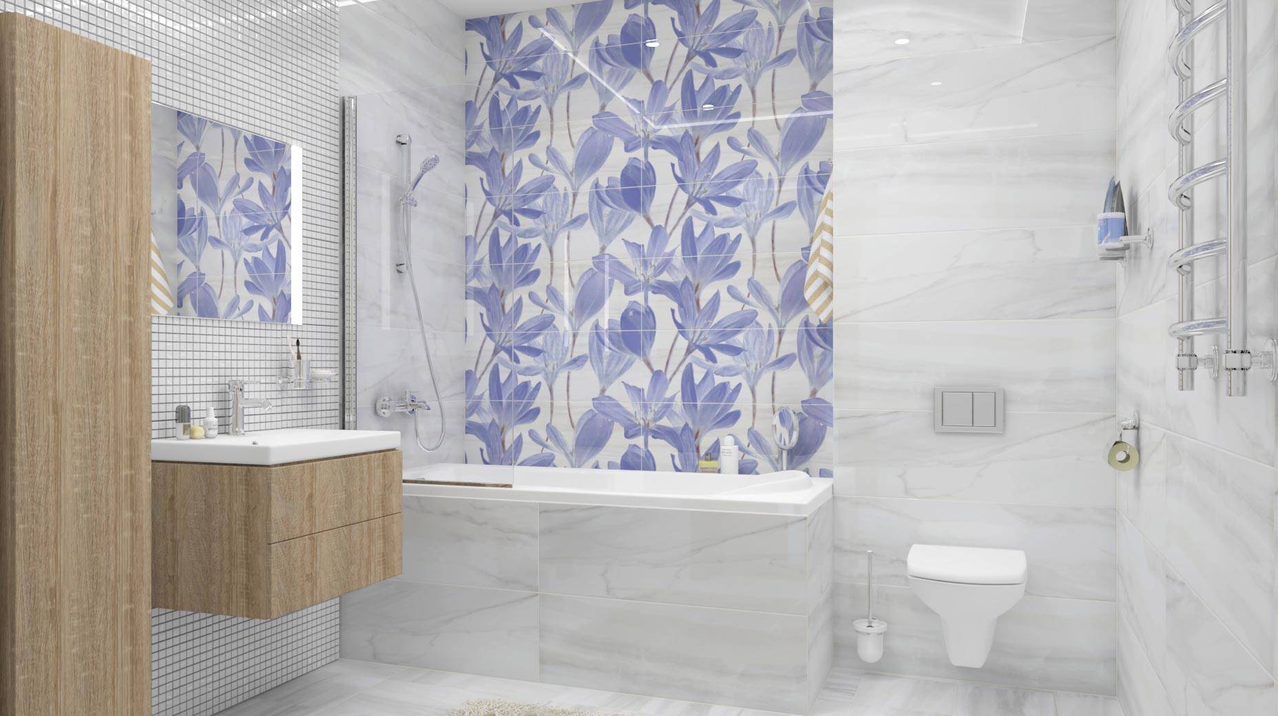 Слишком маленькие элементы будут визуально сужать пространство, а большие сделают его массивным и грубоватым. От рисунка лучше отказаться совсем или минимизировать его, отдав предпочтение простым мелким узорам. Глянцевая поверхность отражает свет, что позволит «раздвинуть стены». Однако нужно помнить, что она скользкая, а это противопоказано в ванных комнатах.