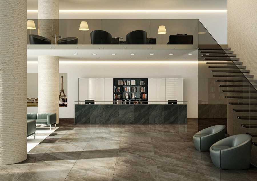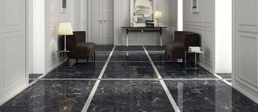 Серый мрамор выпускается с живописной структурой рисунка, и прохладным оттенком, который делает каждую комнату индивидуальной. Такой материал сочетается с белым, плиткой под дерево и составляет признаки классического интерьера.