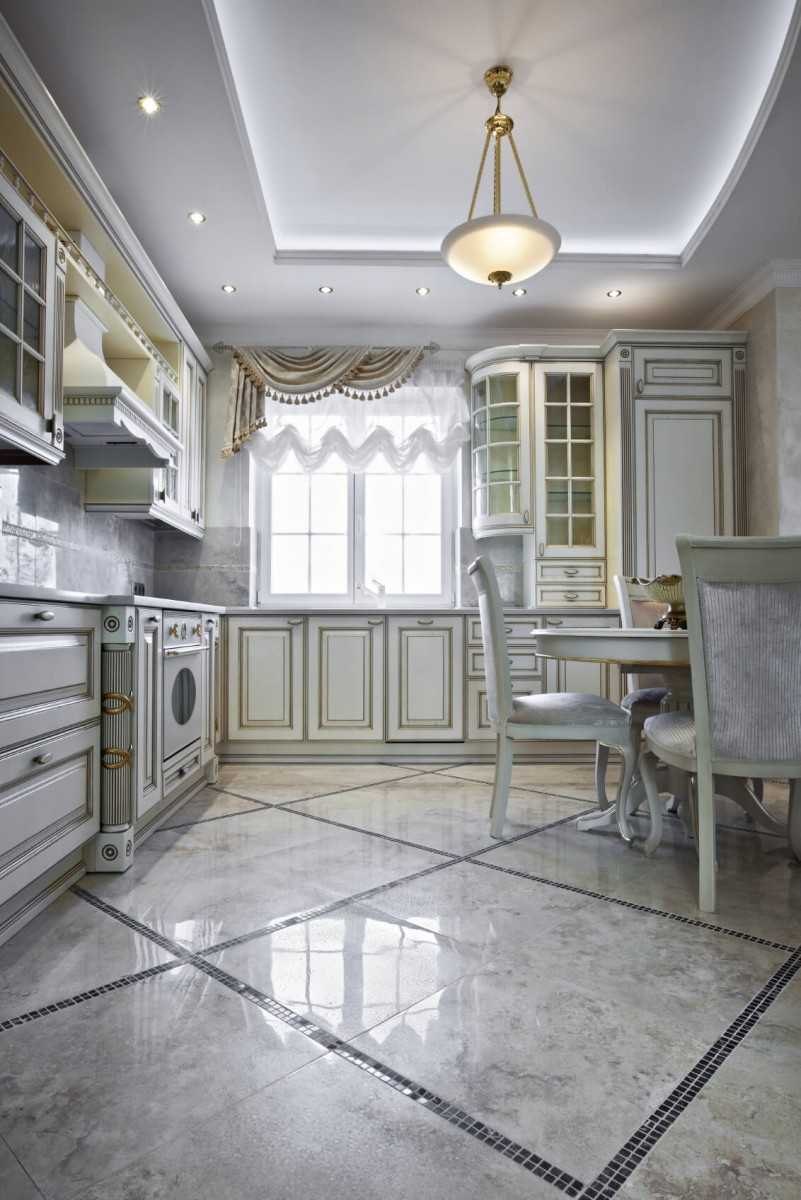 Для такого интерьера подойдет белый, серый или бежевый мрамор. Лучше выбирать плитку с прожилками – такой дизайн идеально подходит для классики. Пол можно сделать однотонный светлый, а можно белые плитки комбинировать с черными. Такое сочетание всегда богато и интересно.