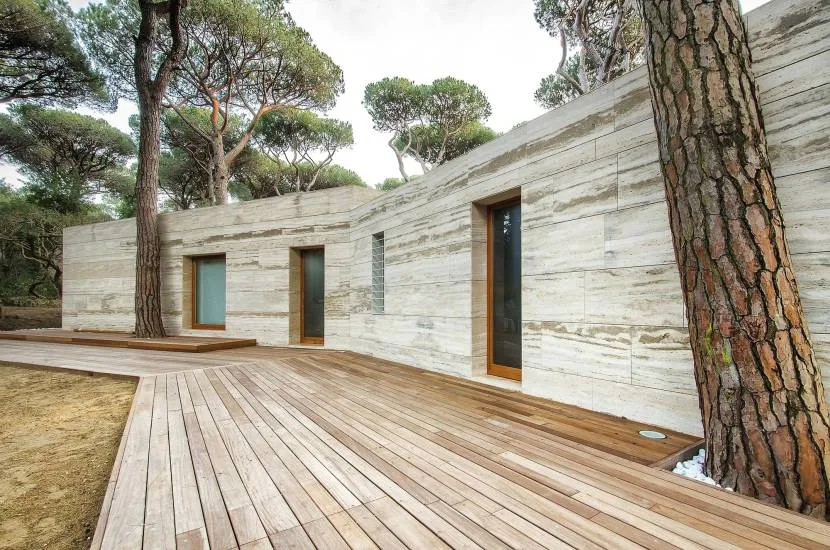 - Экологичность. Когда фасад нагревается солнцем, травертин не выделяет вредных испарений, в отличие от искусственного аналога.