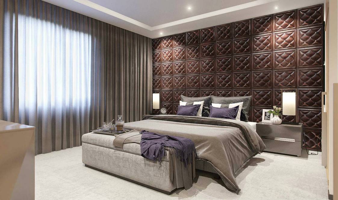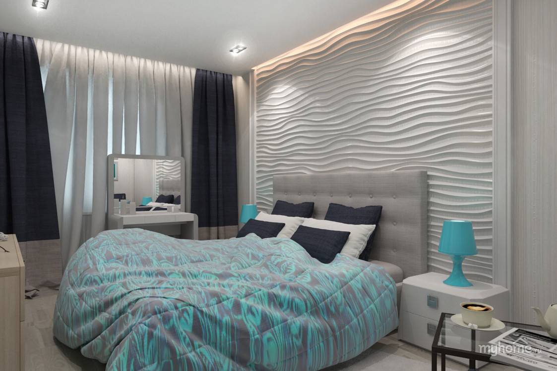 3. Спальня. Дизайнеры советуют использовать для облицовки рельефную непрозрачную плитку. Это могут быть выпуклости и шероховатости, деревянные узорчатые поверхности либо белая гипсовая волна.