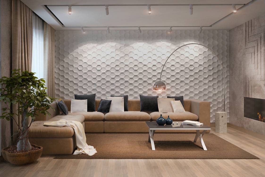 2. Гостиная. Для этой комнаты лучше всего подходят плитка 3D, в основном, однотонная. Эффектно будут выглядеть такие узоры: ветки, листва, геометрия