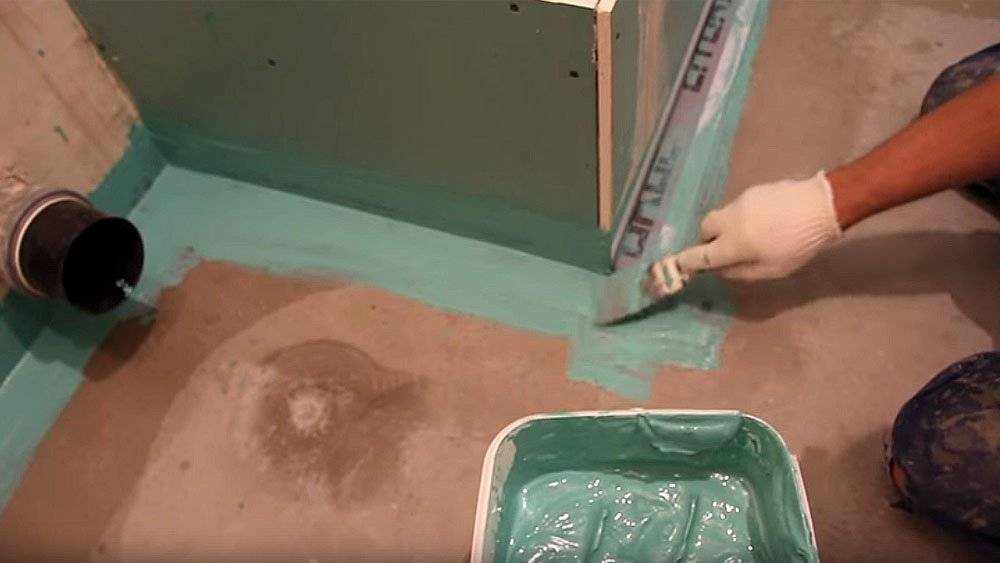 В местах с повышенной влажностью и наличием труб водоснабжения и отопления, таких как ванная комната, туалет, кухня и т.п., необходимо перед укладкой плитки на пол провести работы по гидроизоляции. Для этого отлично подойдут обмазочные гидроизоляционные смеси, которые смешиваются с водой и наносятся кистью на поверхность пола с захватом стены на 15 см и прокладкой гидроизоляционных лент в угловые соединения.