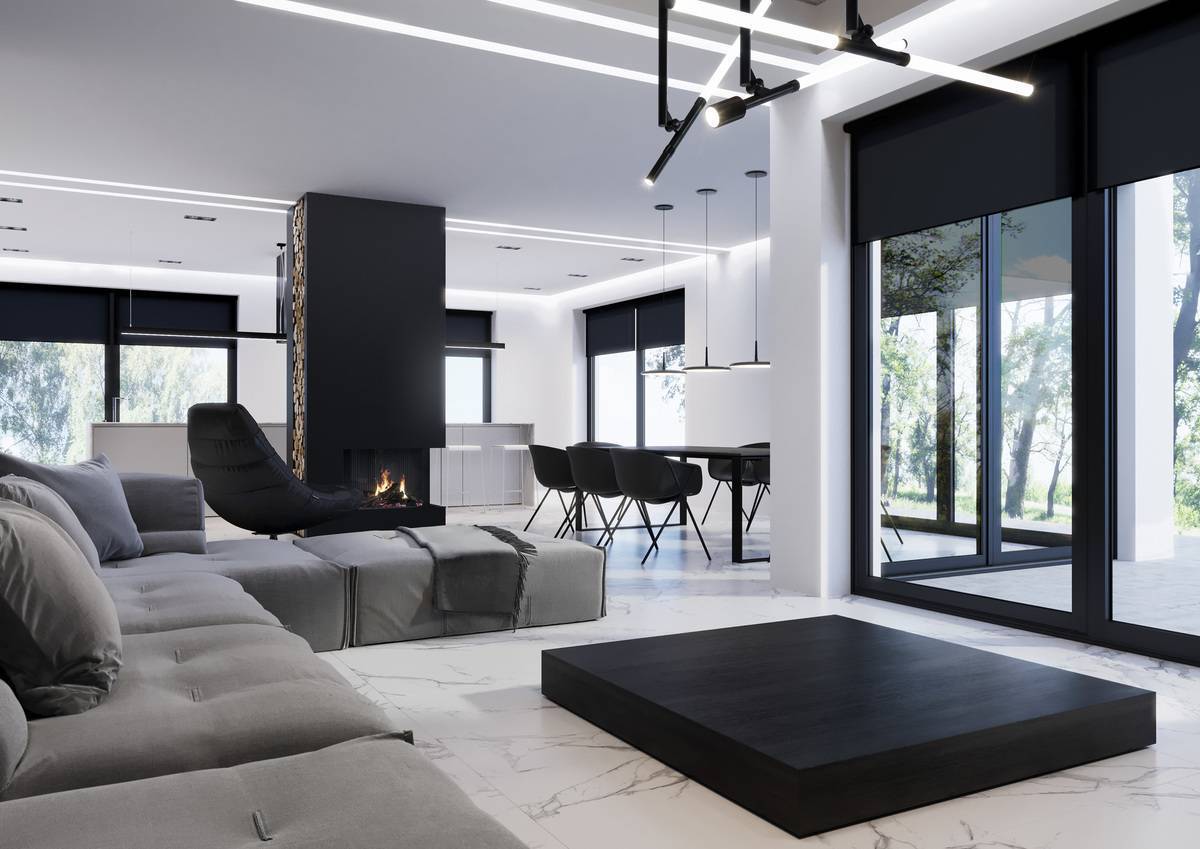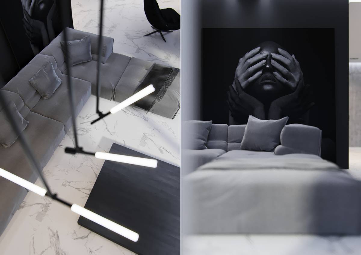 Шикарный интерьер с использованием чёрного и белого керамогранита под мрамор. Коллекция LUXURY (PERONDA MUSEUM, Испания).