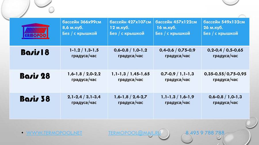 | Таблица нагрева воды в бассейне (серия BASIS) |