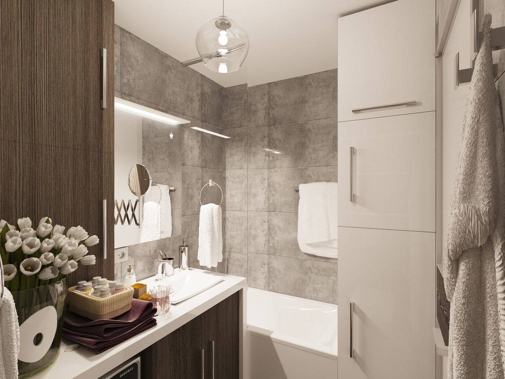 Не переусердствуй с линейной планировкой, чтобы ненароком не получить вагон поезда – сделай несколько акцентов поперек. Это может быть сама ванна у дальней короткой стены, порожек для перехода между разными цветами плитки или невысокий пуфик в углу.
