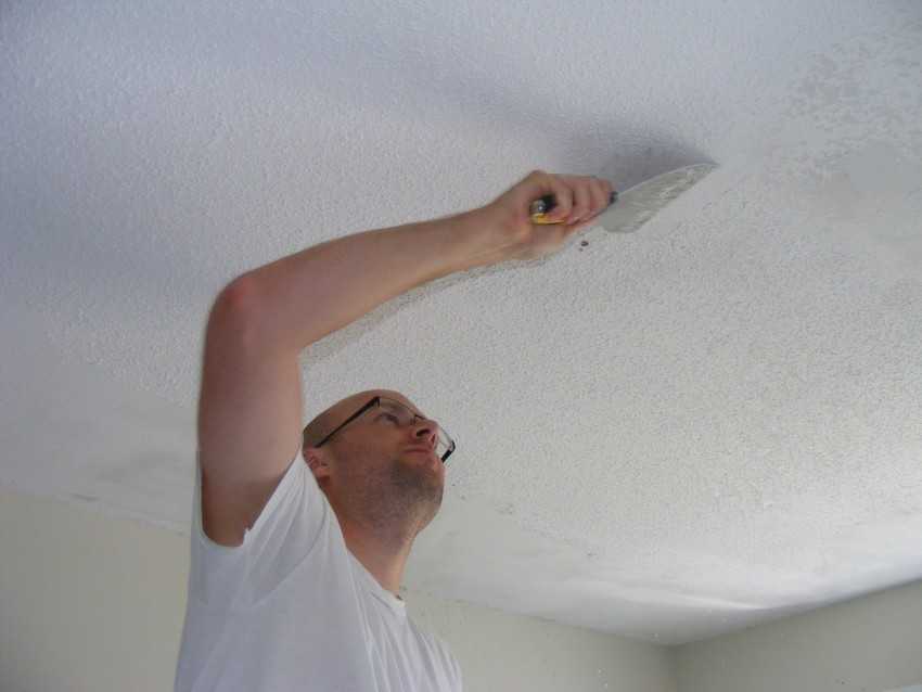 - Удаляем с потолка то, что легко удаляется само, можно смыть побелку или слегка зачистить облупившуюся краску, удалить обои или другое старое потолочное покрытие.