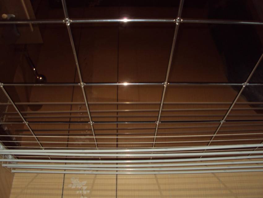 Его легко монтировать и при этом не нужно тщательно выравнивать поверхность. Достаточно того, что подвесные балки крепятся на потолке, а к ним, соответственно, рейки. На них и будут установлены зеркальные плиты. Что характерно, здесь в случае необходимости можно заменить часть покрытия, при этом не потребуется демонтировать весь оформленный потолок.