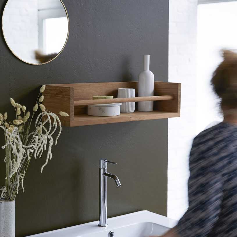 Цельная древесина реже, но всё же используется в производстве полок для ванной комнаты. Такие изделия обладают весьма стильным дизайном, очень прочные и практичные в быту.