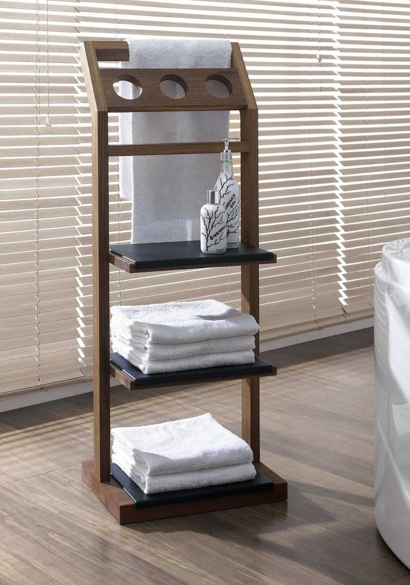 Для изготовления систем хранения для ванной комнаты лучше всего подходят экзотические породы древесины, такие как гавея, мербау, бамбук и тик, которые насыщенны натуральной водоотталкивающей пропиткой. Первая разновидность представлена каучуковым деревом, которое обладает способностью отталкивать воду и не подвергаться гниению. По плотности гавея схожа с дубом