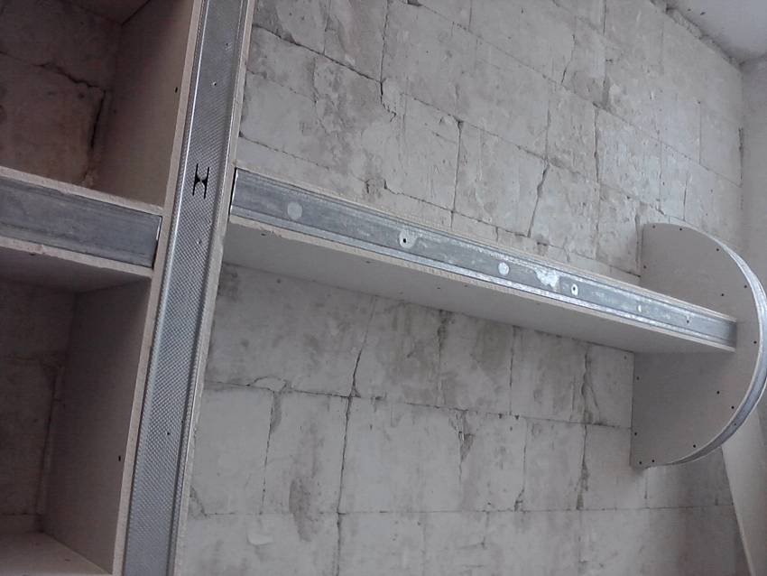 Далее к краям горизонтальных направляющих крепятся несущие профили. К ним будут фиксироваться горизонтальные элементы, которые будут являться основой для будущих полок. Затем выполняется обшивка листами из гипсокартона вертикальных стоек конструкции. Если не получается смонтировать один по высоте элемент, он должен быть установлен со стыком, который будет опираться на перемычку. Такое решение исключит образование трещин в месте стыка.