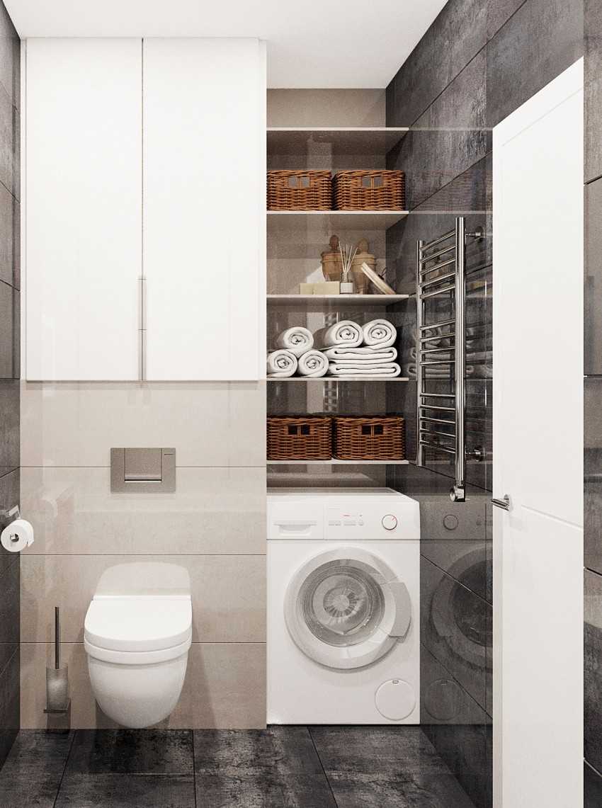 Если в вашем санузле нехватка места в целом, то расположить полки можно прямо под ванной или раковиной. Такой вариант наиболее уместен для сохранности бытовой химии, щеток, тряпок и иных предметов, используемых при уборке помещений.