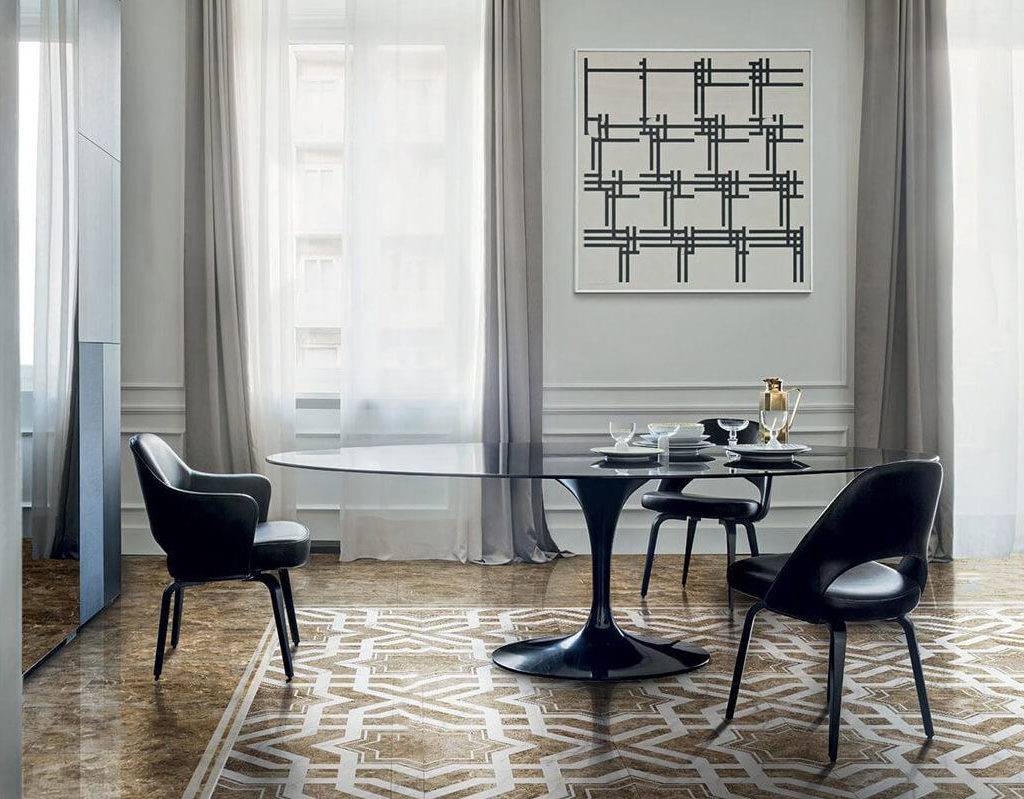 Без черной окантовки по периметру этот интерьер стал бы более спокойным Здесь также чувствуется приверженность к монохромной гамме. Пол из черного и белого мрамора стал главным акцентом и определил выбор мебели. Обивка кресел и блеск их металлических каркасов перекликаются с оттенком и глянцем камня, что и дает гармоничную картинку.