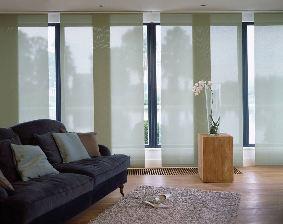 Японские шторы для гостиной отлично подходят для минималистичных интерьеров и окон во всю длину