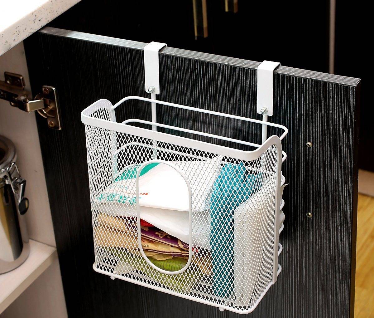 Металлические корзины подходят тем, кто не желает аккуратно в стопку складывать пакеты. Она размещается на внутреннее части двери. Изделие крепкое, удобное и имеет отверстие в нижней части. Для фиксации не требуется дополнительных приспособлений.