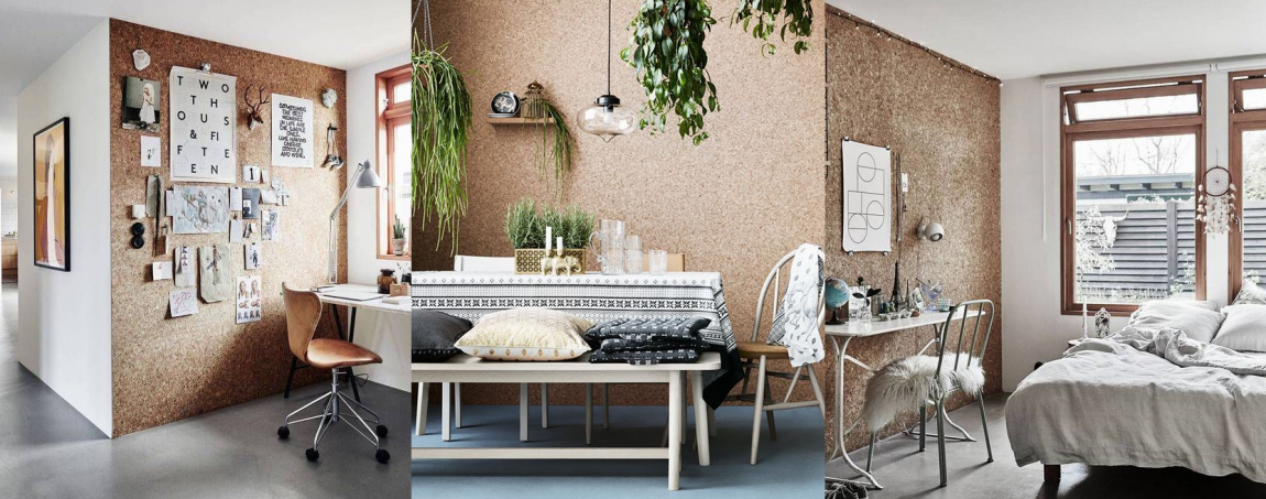 Пробка может стать нетривиальным решением для оформления акцентной стены в комнате: в обеденной или рабочей зоне, за изголовьем кровати, или в ТВ-зоне в гостиной.