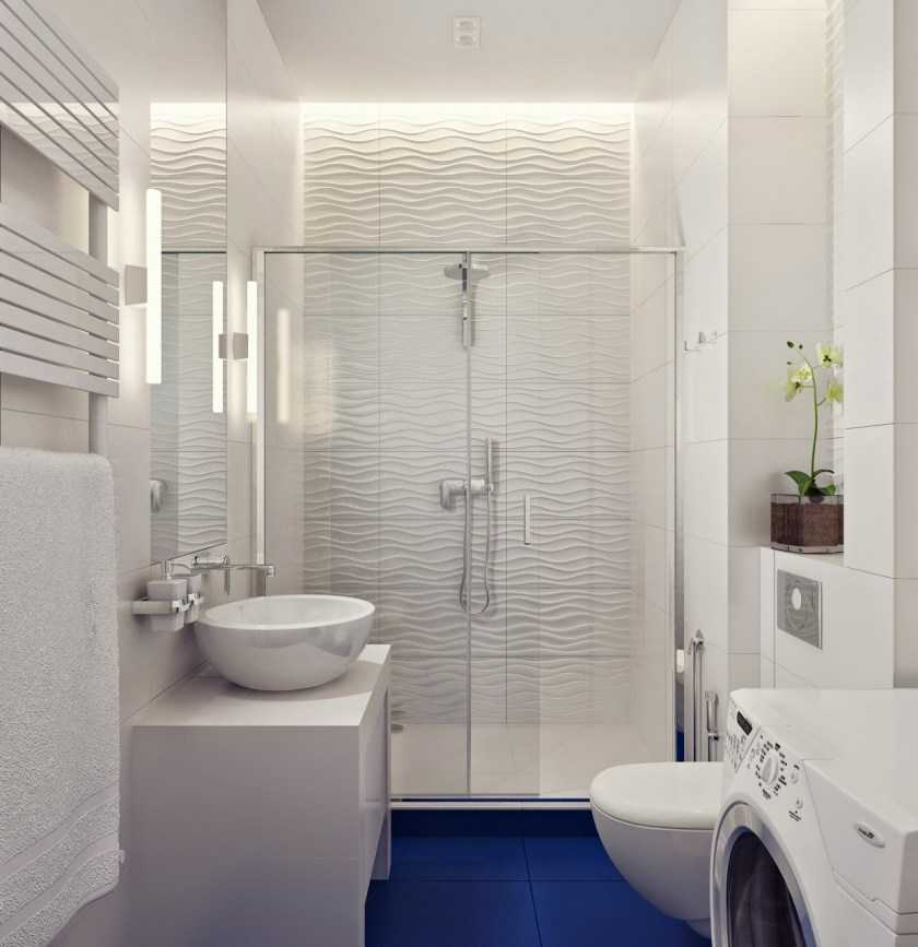 В совмещенном санузле пространства больше, поэтому здесь есть возможность разместить все нужные аксессуары в одном месте. Для обустройства ограниченной площади выбирают компактные предметы мебели, сантехнику. Например, можно использовать подвесной или встроенный унитаз. Раковину также подбирают в стиле минимализм. Для хранения полотенец устанавливают сушилку простой прямоугольной формы. При планировании пространства предварительно разделяют площадь на функциональные зоны. При желании их оформляют в разной цветовой палитре. Отличным решением по дизайну ванной комнаты маленького размера станет использование стеклянной ширмы. Практичное, стильное изделие визуально не скроет пространство. Дизайн маленькой ванной комнаты совмещенной с туалетом предполагает использование подвесных полков, стеллажей, чтобы максимально спрятать личные предметы гигиены. Так как загроможденные участки визуально скрадывают площадь. Под раковиной можно поставить корзину для белья, если место свободно.