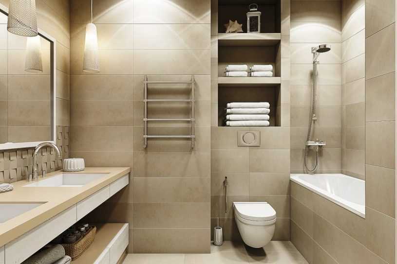Дизайн ванной комнаты, совмещенной с унитазом, сохранит эстетику, если удастся избежать наличия разбросанных вещей. Подвесные стены и гипсокартонные коробки, мебельные фасады помогут замаскировать некрасивые детали. Используются пластиковые экраны, гидрозатворы, облицовка каркасных конструкций плиткой.