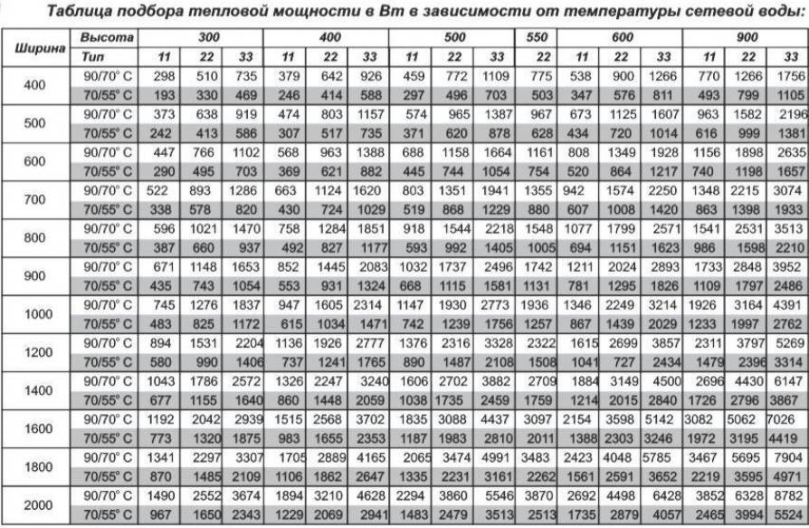 Для подбора оптимального вида радиатора, а именно стального, существует специальная таблица расчета мощности стальных радиаторов. Имея рассчитанную мощность, затрачиваемую на обогрев помещения, и такую таблицу, нужно только посмотреть по ней, какой должна быть ширина и высота оборудования, а также его тип. Пример подобной таблицы приведен ниже.