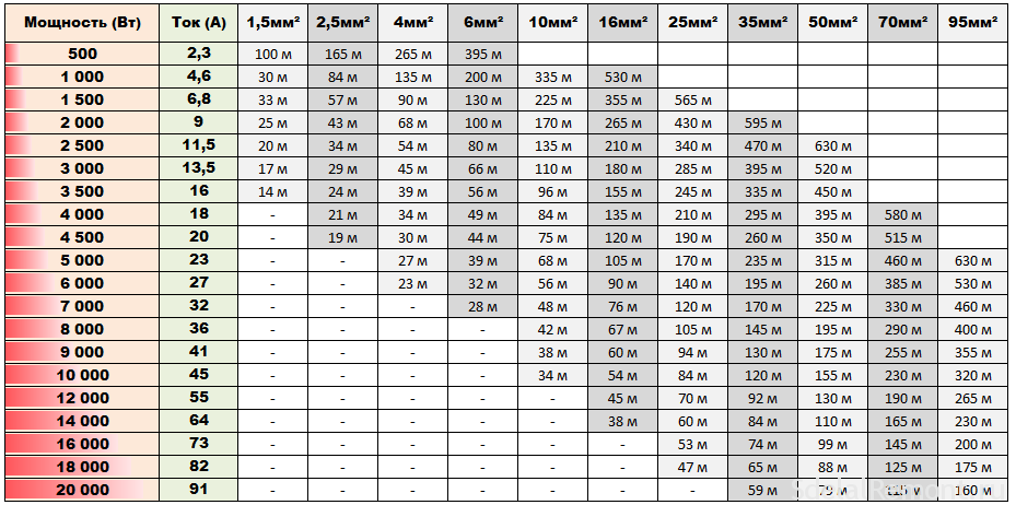 Таблица по подбору сечения провода в зависимости от мощности (Вт)