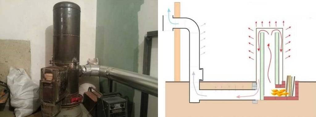 На рисунках показаны особенности конструкции, которые обеспечивают достаточную тягу при увеличении длины пути удаления дыма. Другое преимущество – высокотемпературное разложение органики при ограниченном поступлении кислорода (пиролиз).