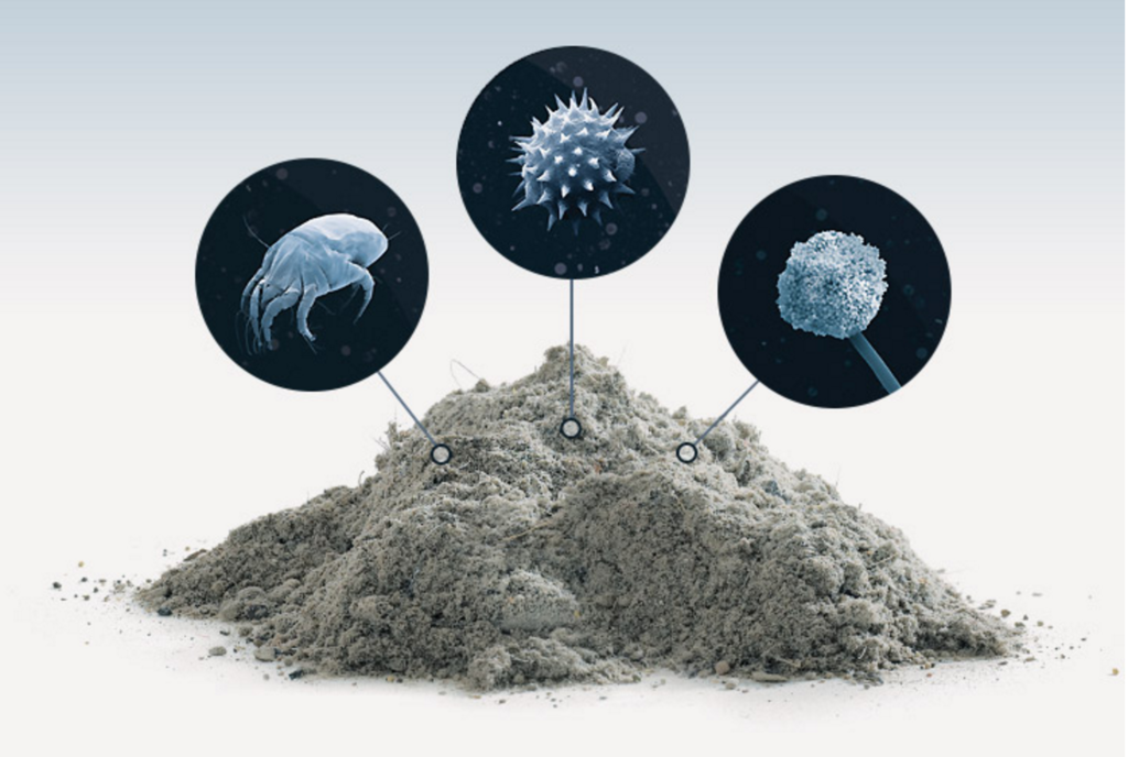 Домашняя пыль – это скопление мельчайших частиц: волокон ткани и бумаги, ороговевших клеток кожи, шерсти животных, цветочной пыльцы, осыпающейся побелки, спор плесени и многого другого. Все это является благоприятной средой для появления пылевых клещей. Продукты жизнедеятельности клещей – сильнейший аллерген и причина многих заболеваний.