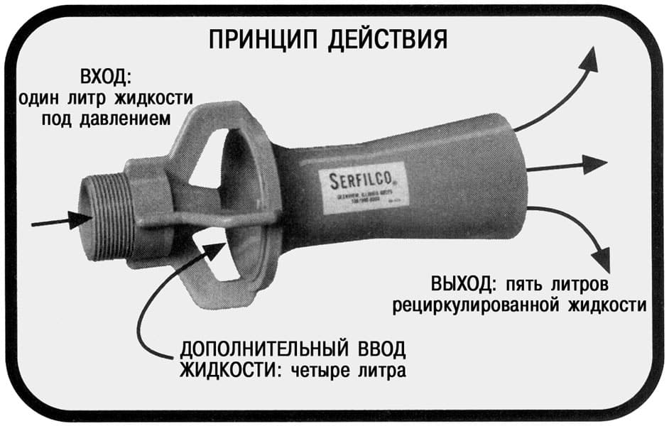 По закону Бернулли такой поток оказывает небольшое давление на окружающую его среду, затем он попадает в смеситель, где создается значительное разряжение, за счет которого из камеры всасывания начинают поступать дополнительные объемы воды. Объединившись в единый поток, жидкость сквозь диффузор поступает далее в трубопровод.