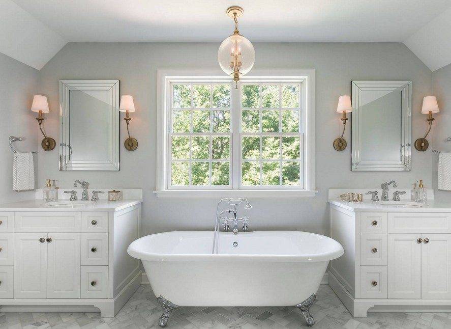 Классика. Ванная в классическом стиле напоминает в большей степени жилую комнату. На окно, если оно есть, в большинстве случаев вешают изысканную портьеру.