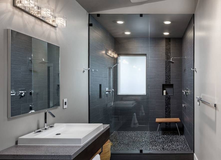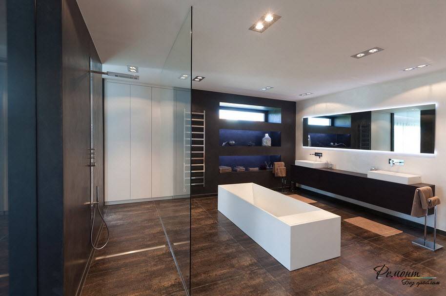 Интерьеры ванных комнат в современном стиле очень требовательны к освещению. Как правило, имеется несколько световых сценариев, которые задействуются в различных ситуациях. Помимо общего света, за который, как правило, отвечают точечные потолочные светильники, в ванных комнатах используют подсветку зеркал, отдельно висящие бра, подвесы в зонах умывания, а также фальш-окна.