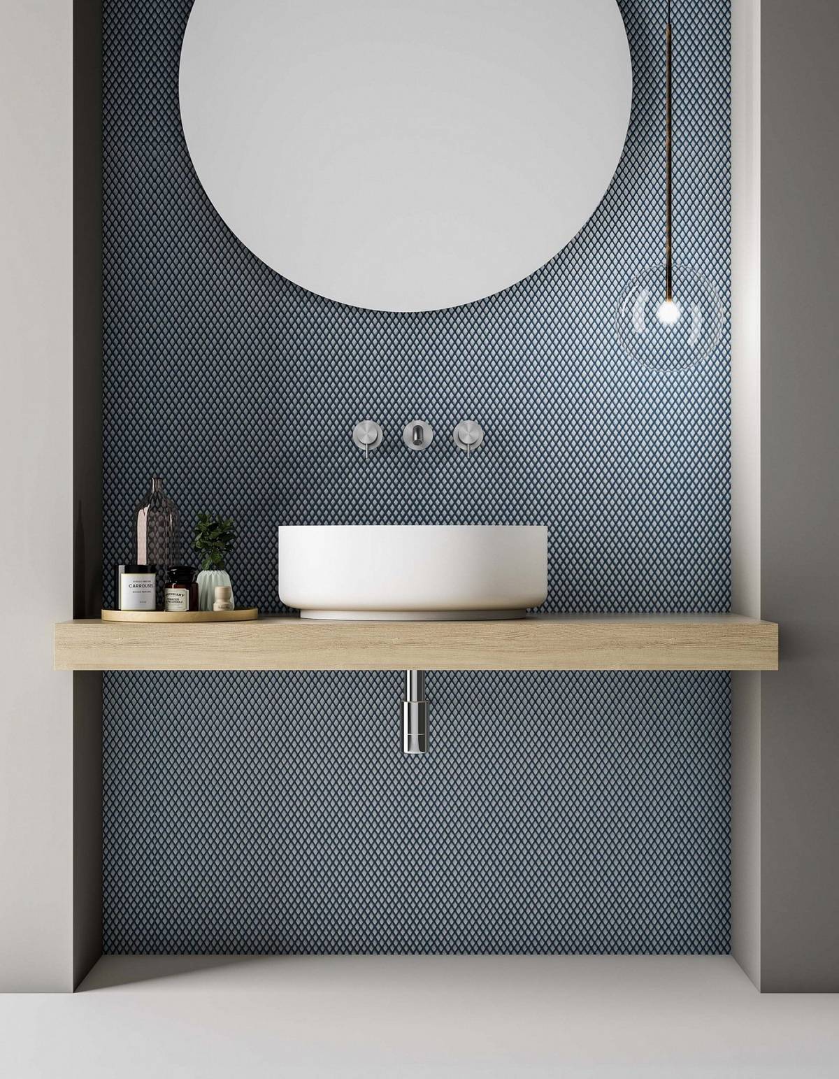 Средиземноморские мотивы в ванной будут продиктованы мелким кафелем цвета морской волны. Такая отделка отлично сочетаема с деталями из пробкового дерева светлых оттенков и аксессуаров на морскую тематику.
