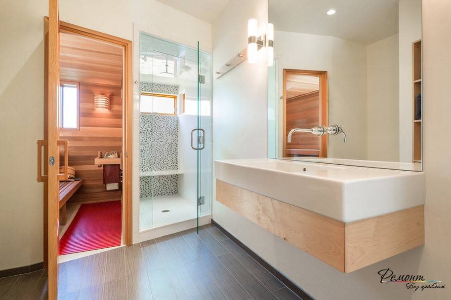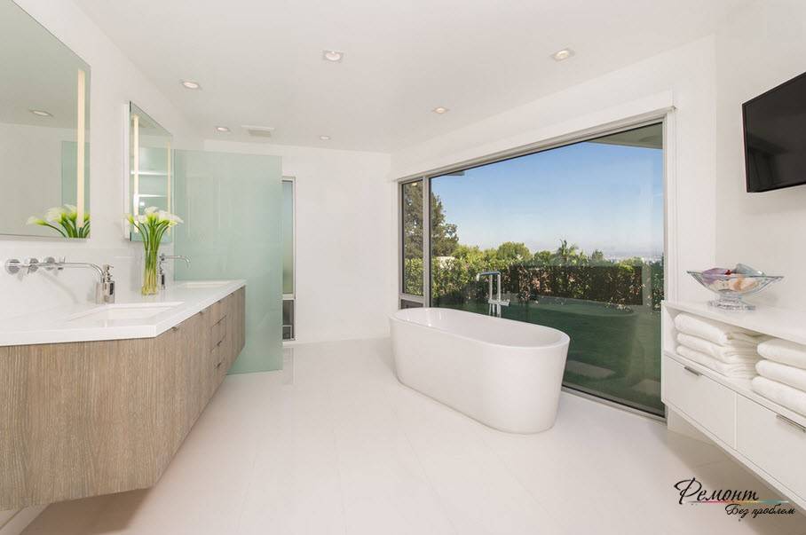 Престижная отделка требует в компанию участие красивой ванны. Согласно вашему желанию подход к ней могут обеспечить ступени. В другом варианте подиум допускается расширить в границах, и превратить купель в мини-бассейн. Душевую кабину не стоит включать в комплект и лучше смонтировать автономно. Оснащение дополнительным функционалом – гидромассажной системой и ароматерапией заменят SPA салон.