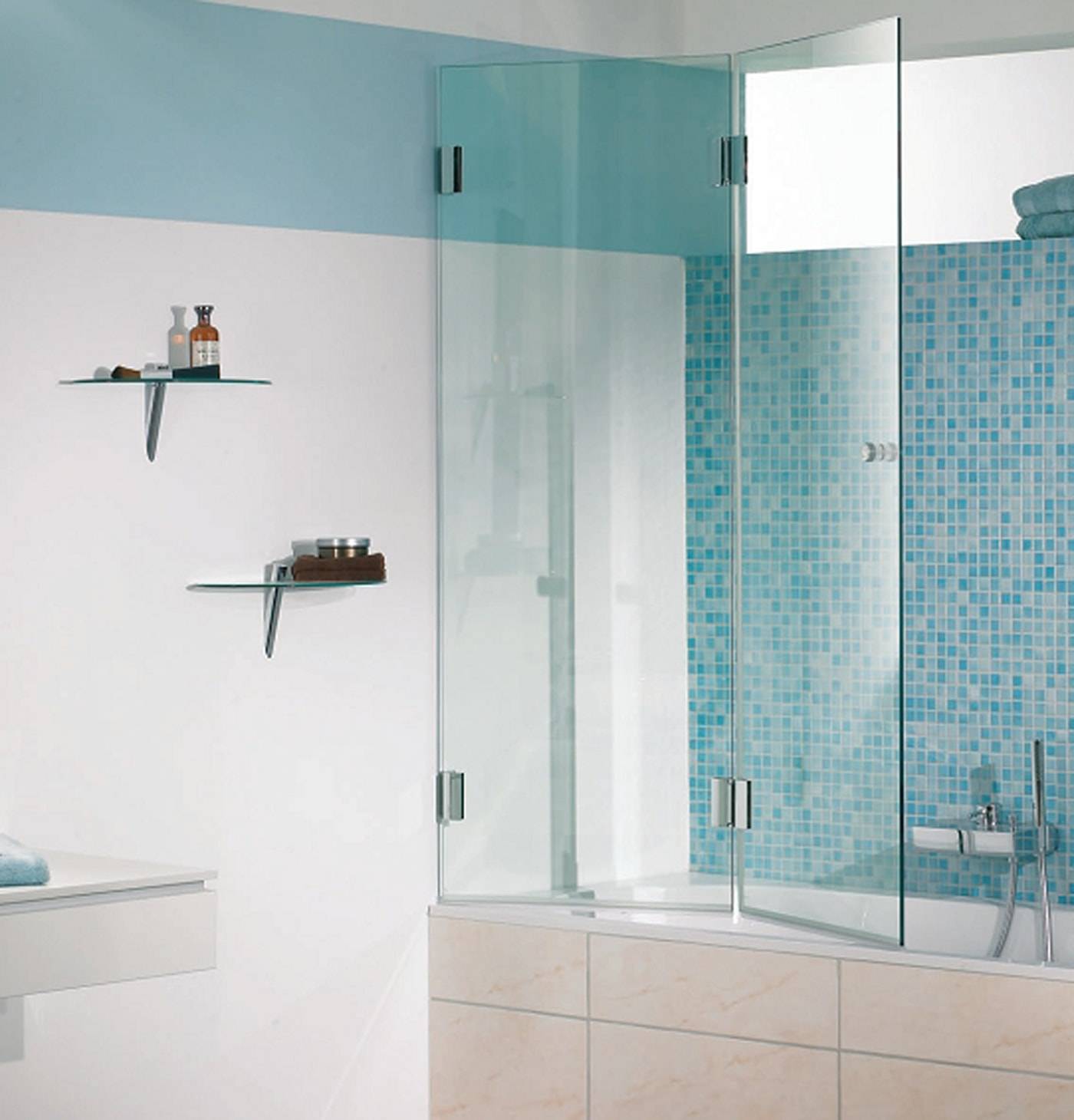 Напомним, что стеклянная шторка – это не просто элемент дизайна, она должна нести вполне понятную функцию – защита от воды. Следовательно, шторка должна располагаться таким образом, чтобы вода, попадающая на неё, свободно стекала в ванну.
