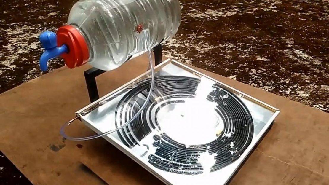 Здесь важно подобрать шланг по горлышку бутылки и сделать конструкцию наиболее герметичной. Тогда будет происходить быстрый и существенный нагрев воды в шланге