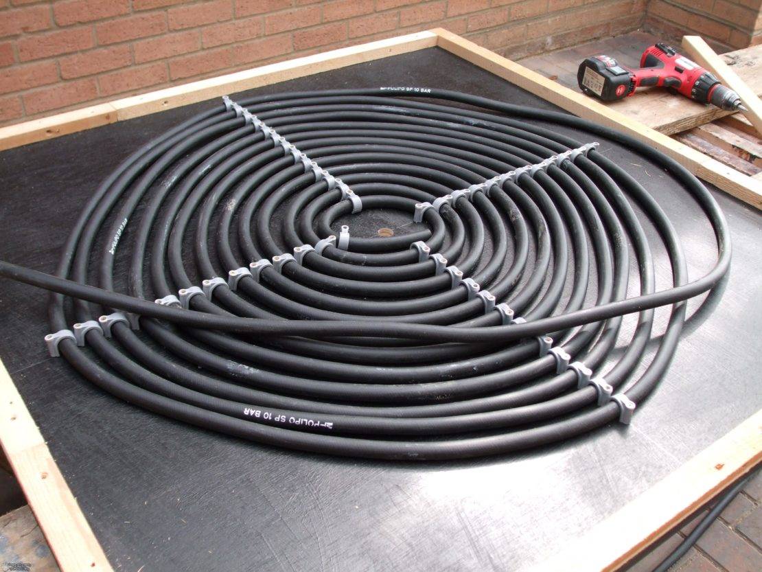 К примеру, в качестве системы трубок могут использоваться обычными с садовые шланги для полива. Они укладываются на тёмный, матовый материал. Это может быть резина, покрашенный в чёрный цвет пенопласт, рубероид и так далее. Если вы делаете конструкцию на один сезон, то можно сложить шланг обычной бухтой, подключить к воде, и всё.