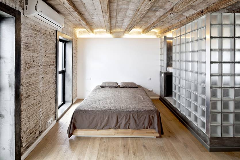 Еще одно направление использования материала — зонирование пространства одной комнаты с помощью перегородок. Перегородки из стеклоблоков могут быть различной формы. Они прекрасно подходят как для отделения обеденной зоны на кухне, так и для создания уютной спальной зоны в гостиной.