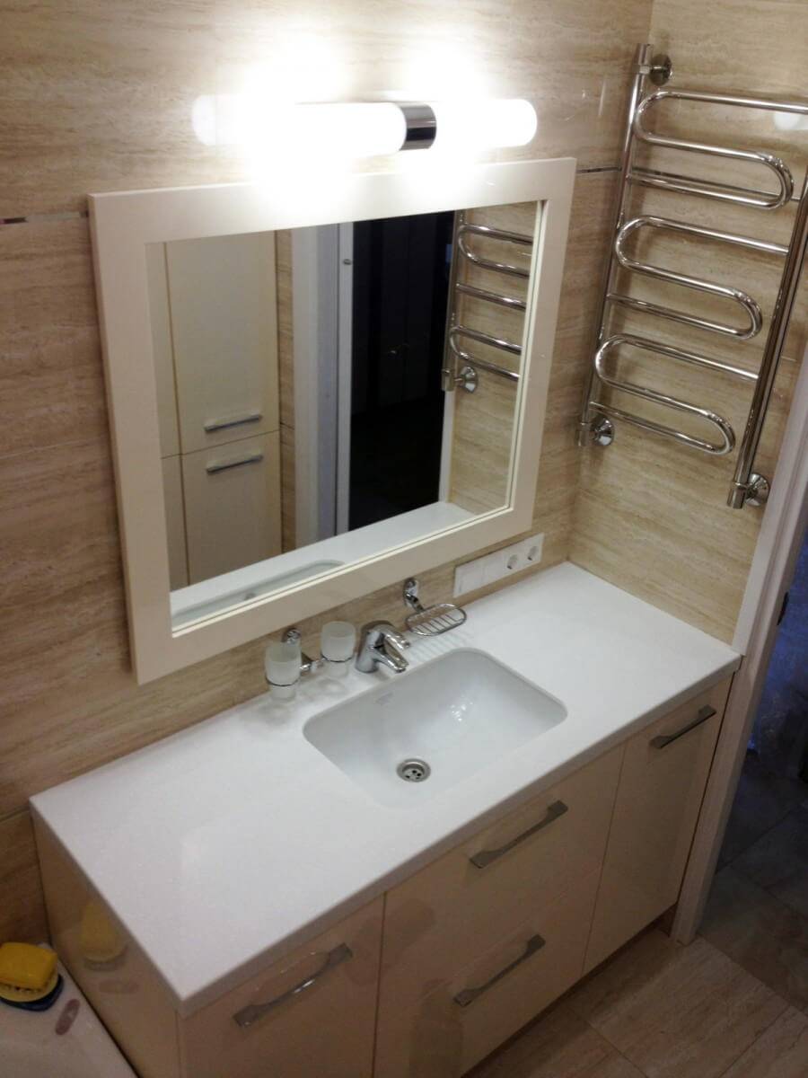 Чем ближе столешница оказывается к ванной или душу, тем более водостойкие материалы для нее нужно использовать.