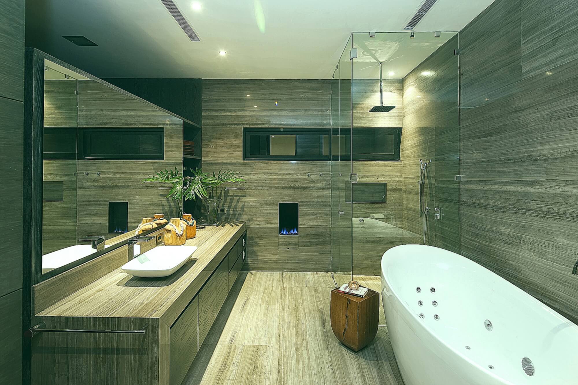 Большие ванные комнаты тоже выиграют от такого рода мебели. Но здесь есть возможность установить длинную столешницу – от стены до стены, и под одной поверхностью собрать не только стиральную машину и умывальник, но и полки, ниши, разного рода ящики. У конструкции есть и другие преимущества: