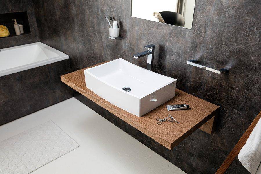 На рынке представлен очень широкий ассортимент деревянных столешниц и досок со шпоном под дерево. Стоит ли выбирать натуральный материал, например дерево, или доску? Ответ прост: только деревянная столешница — это элемент, который действительно украсит вашу ванную комнату! Дерево, предназначенное для столешниц, водонепроницаемо. Покрывая их дополнительно маслом или лаком, вы создадите полностью сохранившуюся деревянную поверхность. Стоит сделать ставку на изделие из массива дерева. В случае древесно-стружечных плит необходимо следить за тем, чтобы места разрезов и стыков были хорошо изолированы, например, силиконом.