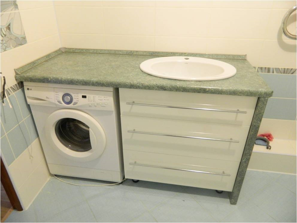 - Практичность. Учитывая особенности монтажа, пространство под столешницей остается свободным (как правило, под такую столешницу устанавливают стиральную машинку).