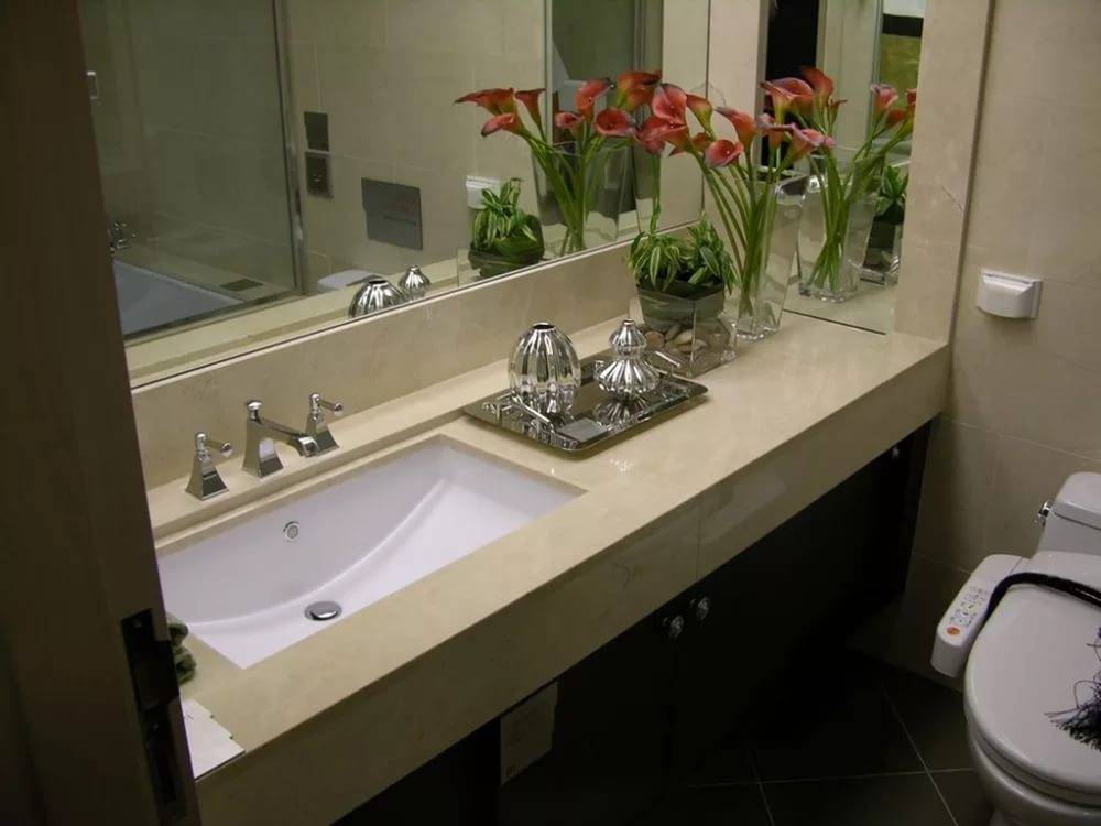 Ванные со столешницей всегда будет выглядеть ухоженно и аккуратно, что важно для каждого владельца комнаты