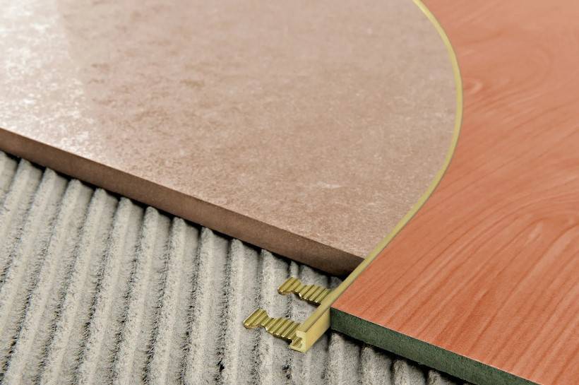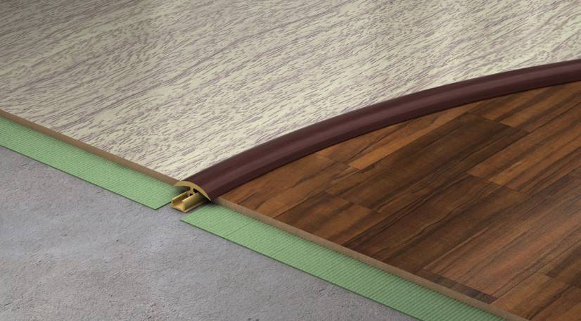Стыковочный профиль для плитки и ламината этой разновидности отличается двойной структурой: основание, декоративная крышка. Первая часть фиксируется к бетонному основанию посредством использования саморезов или дюбелей. Декоративная часть крепится в специальных гибких пазах. Их эластичность обеспечивает возможность применения изделий при оформлении изогнутых стыков разной длины.