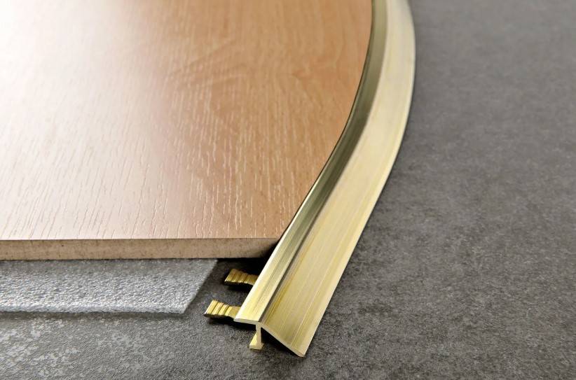 На прямые стыки могут быть установлены любые порожки. На изогнутые только гибкие варианты из металла или пластика. Важна и глубина стыка. Если она невелика, оптимально использовать детали с внутренней стороной плоской формы. Их можно наклеить на шов. Проще всего приобрести самоклеящиеся порожки.