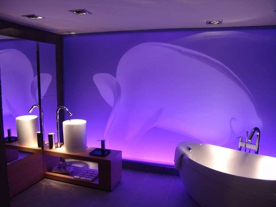 - цветная подсветка — разноцветные (розовые, голубые, зеленоватые) светодиоды могут создать романтическую или загадочную атмосферу в ванной комнате и превратить обычное принятие душа в интересное и релаксирующее времяпрепровождение.