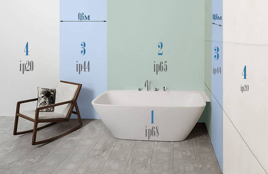 - Третья зона. Распространяется на 60 сантиметров от границы со второй зоной. Здесь светильники обычно не подвергаются прямому воздействию воды, но должны быть защищены от конденсата. Минимальный уровень защиты — IP24.