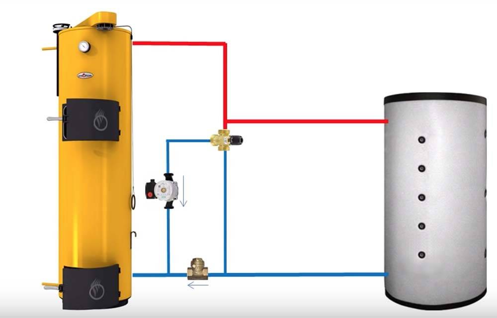 Лучше всего использовать схему включения с подмешиванием или гидроразвязкой. Используются трехходовые клапаны с термостатом. Теплоаккумулятор при этом устанавливается как отдельный элемент системы, параллельно контуру отопления.
