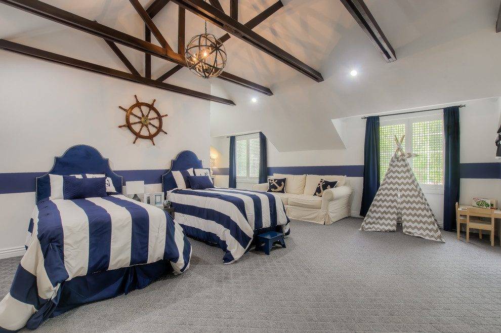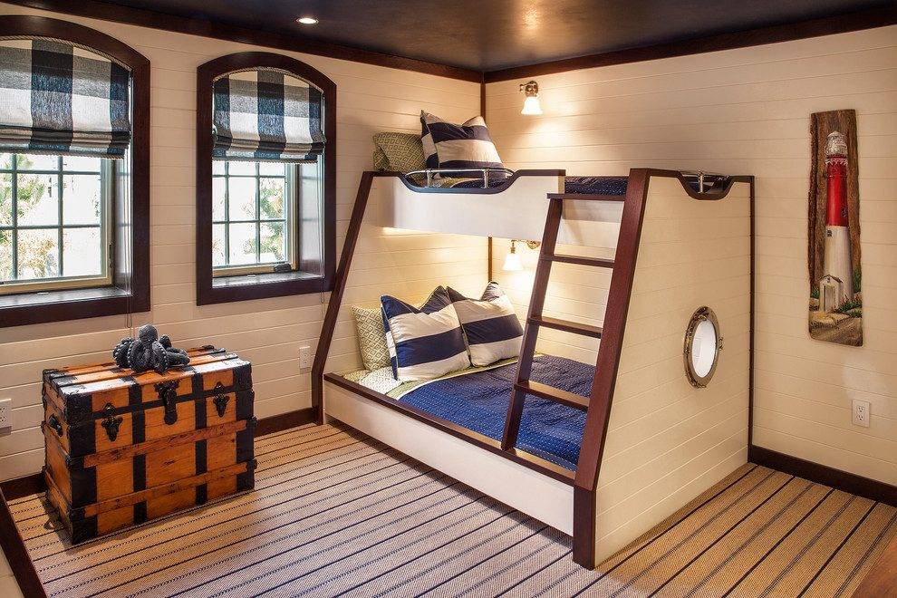 Морская тематика очень часто используется при оформлении детской комнаты. Детали такого интерьера оказывают положительное воздействие на психоэмоциональное развитие ребенка, стимулируют его фантазию. Кстати, именно в этот дизайн как нельзя лучше вписывается двухъярусная кровать, которую в других интерьерах обыграть не так-то просто. Для мальчиков предпочтительно цветовое решение из белого и тёмно-синего. Юному моряку наверняка придутся по душе развешанные по стенам сети, якорь, весла, а также спасательные круги и другие атрибуты. А если поставить в комнате декор в виде фрагментов корабля, это помещение наверняка станет любимой зоной пребывания малыша.