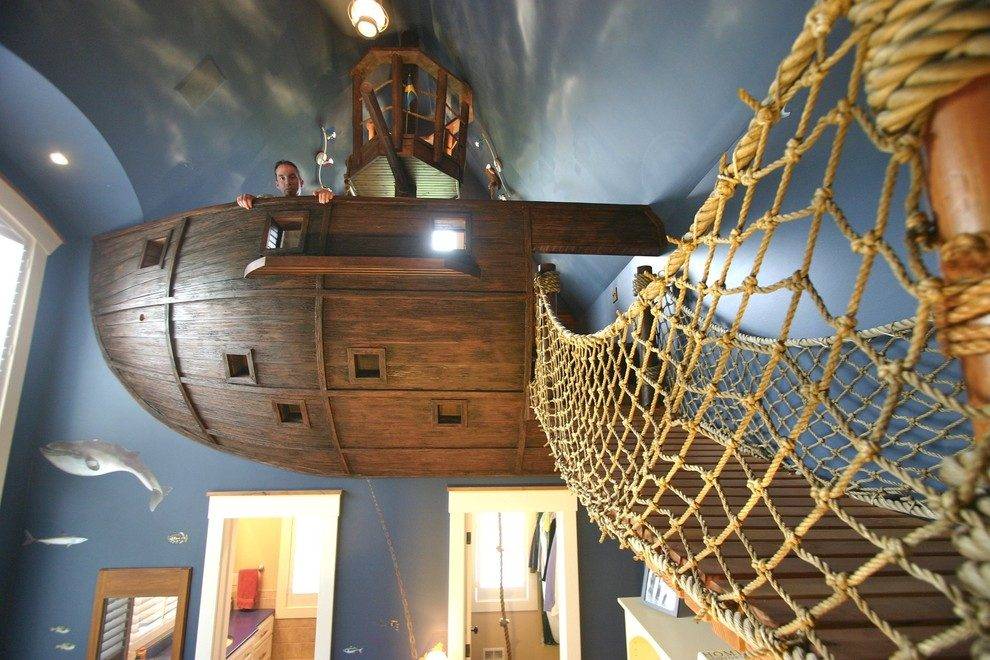 Морской стиль чаще можно встретить в детской комнате у мальчика, который декорируют в «пиратском стиле». Дети любят все необычное, и такой интерьер сможет стать не только отличной альтернативой скучному шаблонному решению, но также многие элементы декора будут крайне полезны для маленького мужчины. Аквариумные рыбки поспособствуют в развитие чувства ответственности, бинокль или подзорная труба пригодятся для познания окружающего мира, глобус и карты дальних стран – для развития географических знаний.