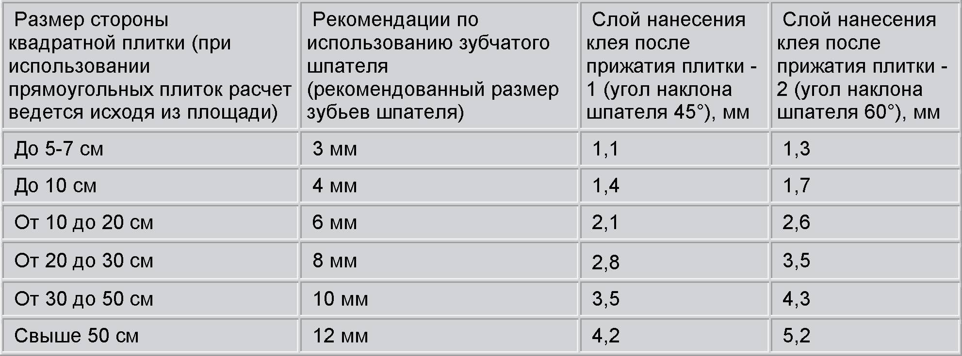 Минимальная толщина клея, наносимого при укладке плитки, рассчитывается индивидуально в зависимости от формата кафеля