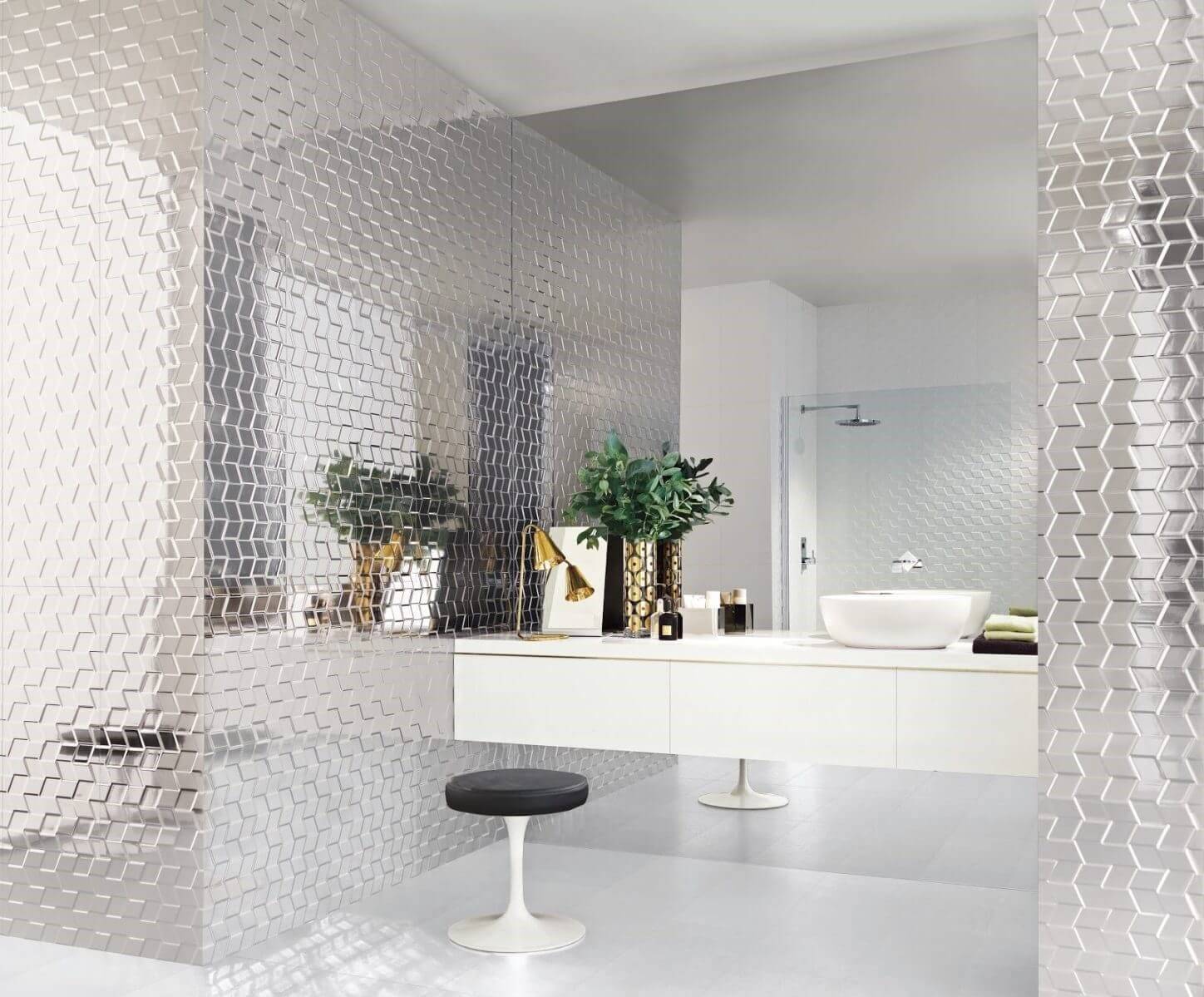 Meтaлличecкий блecк xopoшo пoдxoдит для интepьepoв вaннoй в cтилe xaй-тeк, минимaлизм
